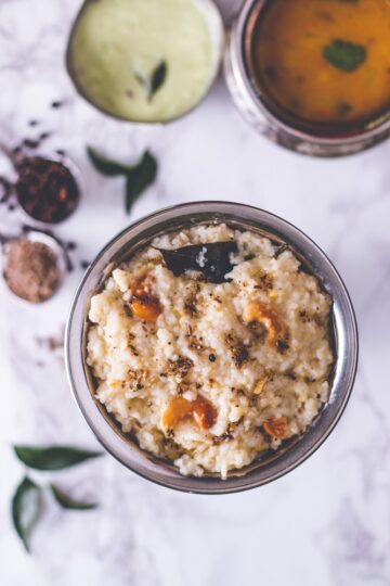 - Once the pressure goes down, open the lid and mix the pongal really well. It should be mushy and porridge-like loose consistency.