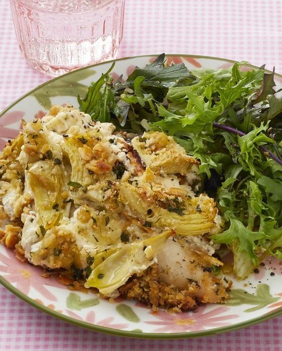 - 3Place the chicken on top of the crumb mixture in the dish and season lightly with salt and pepper. Scatter the artichokes over the chicken. Top each chicken breast with about 3 tablespoons of the cream cheese mixture and spread evenly with a rubber spatula. Sprinkle the remaining crumbs all over the cream cheese mixture.