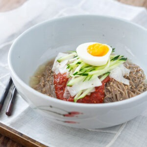 2. Place the cooked noodles in the bowl and add about 6-8 tablespoons of the bibim naengmyeon sauce on top. Garnish the dish with pickled radish, cucumber, Korean pear (if desired), and a hard or soft-boiled egg. Sprinkle toasted sesame seeds over the dish according to your preference. Enjoy your homemade bibim naengmyeon!
