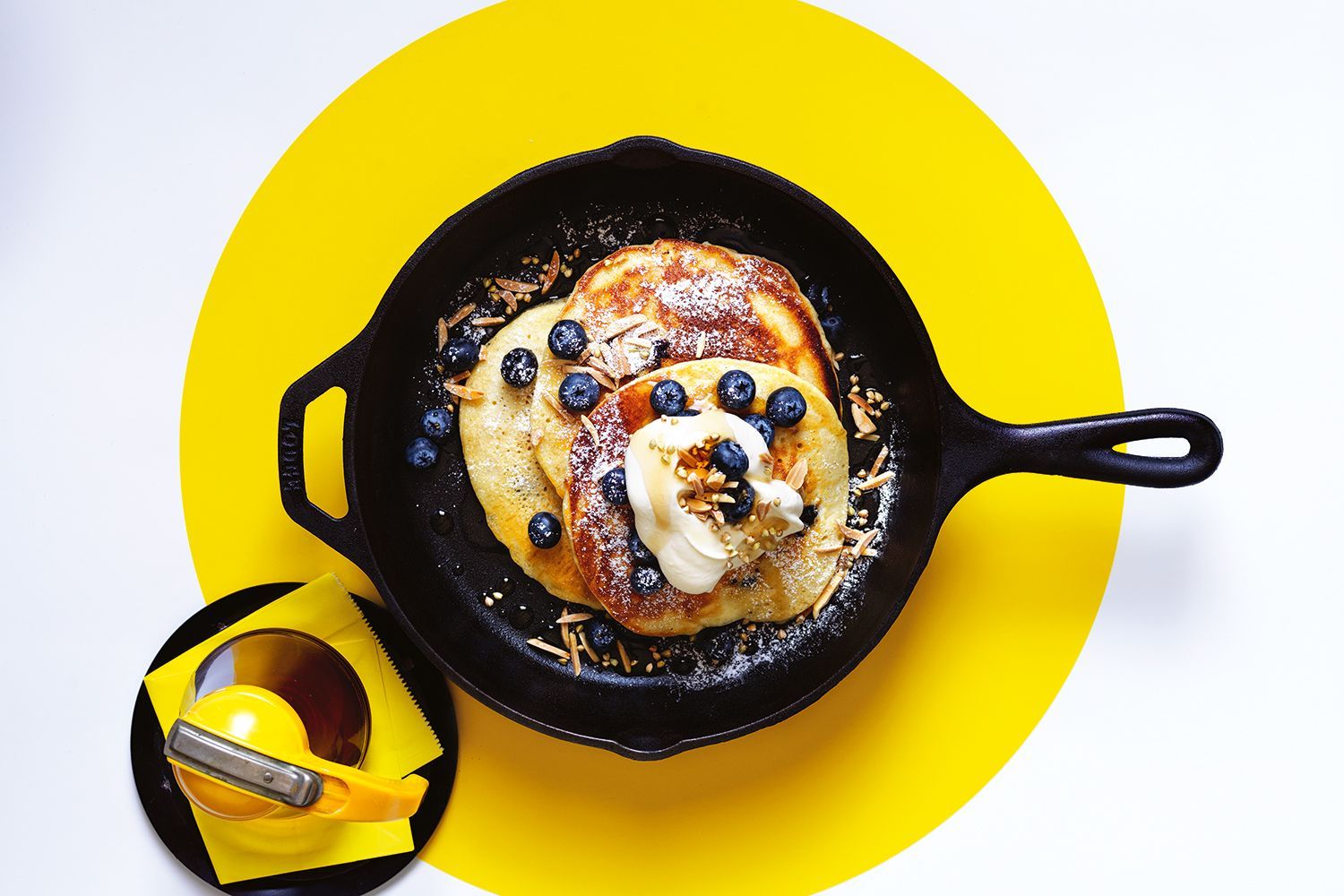 When ready to serve, place hotcakes on serving plates and top with toasted buckwheat, toasted almond, maple syrup, cream, icing sugar and remaining 200g blueberries.