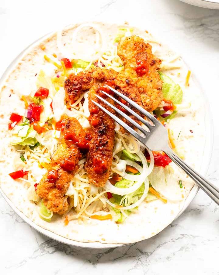 Cut the carrot Jullienne with a mandolin slicer and sprinkle it on top of the other vegetables. Add buffalo chicken tenders and pour buffalo sauce on top of the chicken