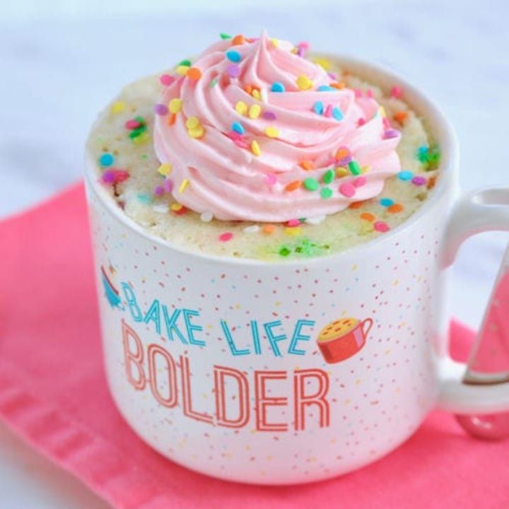 • In a microwavable mug, whisk together the flour, sugar, and baking powder.