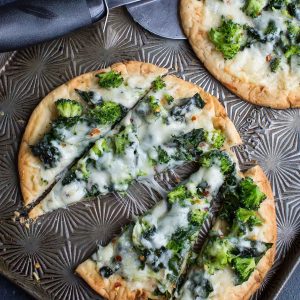 While your flatbread bakes, fill a pot or skillet with 1 cup of water and bring to a boil. Quickly blanch your kale and broccoli for 1 minute. Drain and remove from heat. (You can also sauté them in a little butter or oil if preferred over blanching!) Season with salt and pepper as desired.