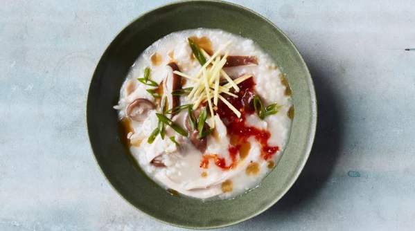 Increase heat to medium and stir in mushrooms; boil, uncovered, until rice breaks down and mixture is creamy, about 20 minutes. Meanwhile, remove and discard skin and bones from chicken; shred meat into bite-size pieces. Remove ginger and scallions from congee; discard.