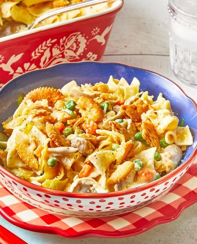 2. 2Stir together the cream of chicken soup, milk, cheese, pepper, and salt in a large bowl. Stir in the chicken, onion, celery, peas, and carrots. Gently fold in the egg noodles. Transfer mixture to a 13-by-9-inch baking dish and spread in an even layer.