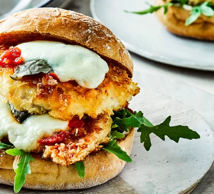 - Spread the toasted bun bases with the garlic mayo then add some rocket. Top with 2 pieces of chicken each and the bun tops.
