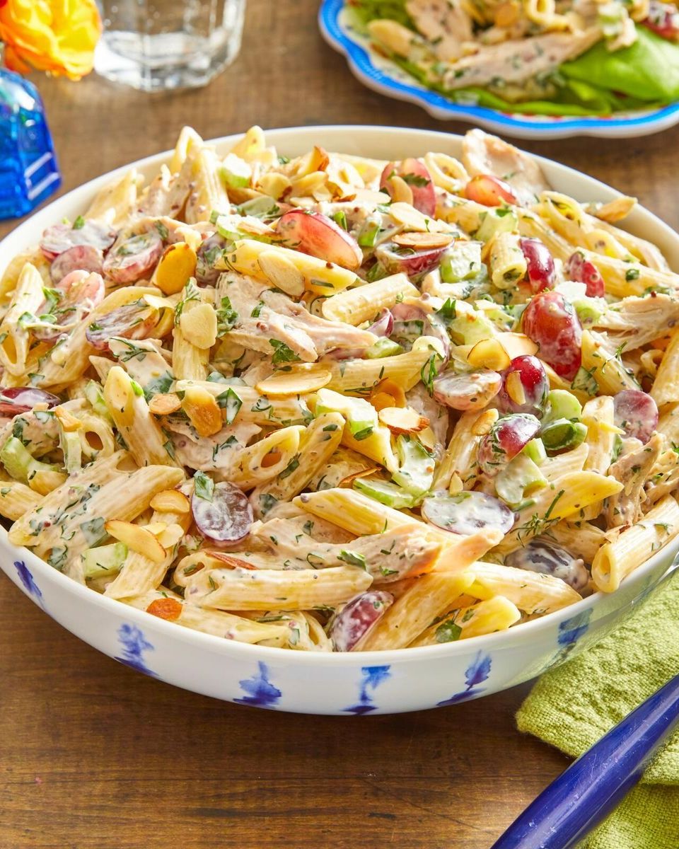 - 2In a large bowl, combine the yogurt, mayonnaise, mustard, lemon zest, lemon juice, salt, pepper, and cayenne. Fold in the pasta, chicken, celery, green onion, grapes, parsley, and dill. Refrigerate until ready to eat.