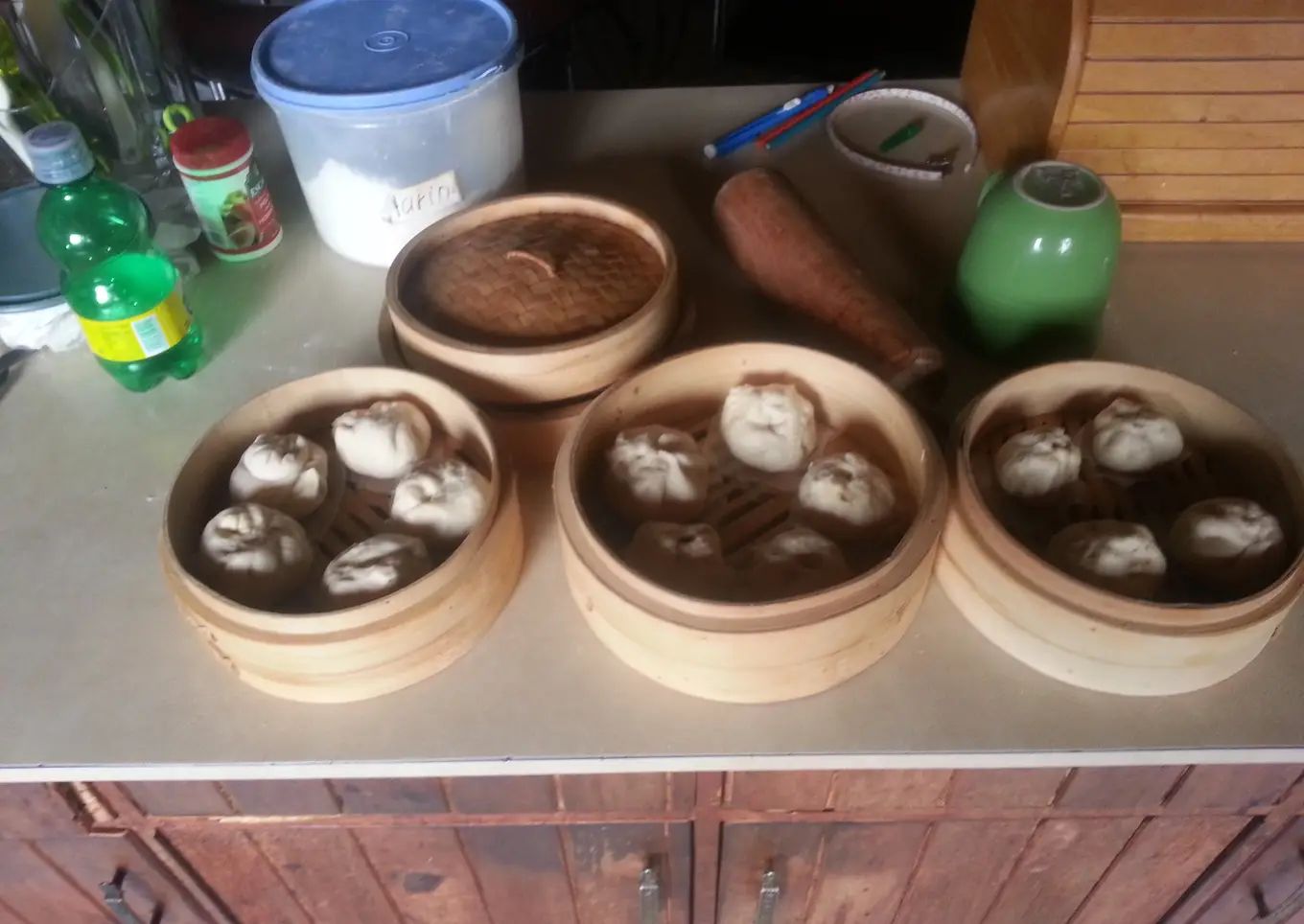 Cooking the steam buns: Stretch the dough and cut it in small circles ( about the size of the palm of your hand or 2-3 inches or 5 to 7.5 cm in diameter). Take a dough circle and hold it by the palm of your hand. Add about a teaspoon or two of the stuffing to the circle and close it taking all the edges of the circle together. Put the bun in an oiled paper and let it rest for 10 minutes. Steam cook the buns for 15 minutes.