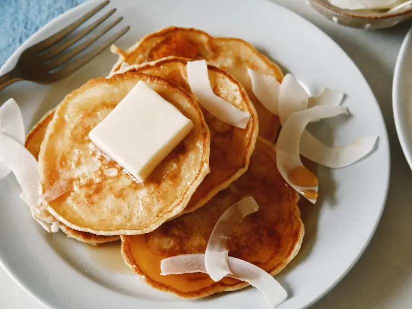 - Heat a large nonstick skillet over medium heat and lightly brush with coconut oil. Making 2 pancakes per batch, pour 1/4 cup of the batter into the skillet for each pancake and top with toasted coconut flakes if using. Cook until the bottom is golden brown and the edges are just beginning to set with some small bubbles forming, 2 to 3 minutes. (If the pancakes are browning too quickly, reduce the heat to medium-low.) Flip and continue cooking until golden brown on the other side, about 2 more minutes. Transfer to a plate. Repeat with the remaining batter, brushing the pan with more coconut oil as needed. Serve with butter, syrup and more toasted coconut.