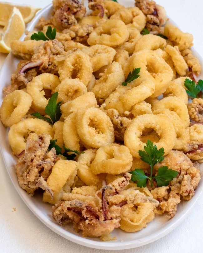 First coat the calamari well in the first semolina bowl then quickly dip the calamari into the cold water. The semolina will sort of wash off but some will still be there to increase the surface area. That means that when you dip it into the second semolina bowl the semolina will bind to it a lot better and a thicker coating will form. Set aside on a plate after the second coating and repeat the process with the rest of the calamari.