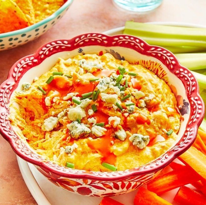 2To serve, garnish the dip with blue cheese crumbles, buffalo sauce, and a sprinkle of chives. Hold on warm for up to 2 hours. Serve with carrots, celery sticks, and tortilla chips.