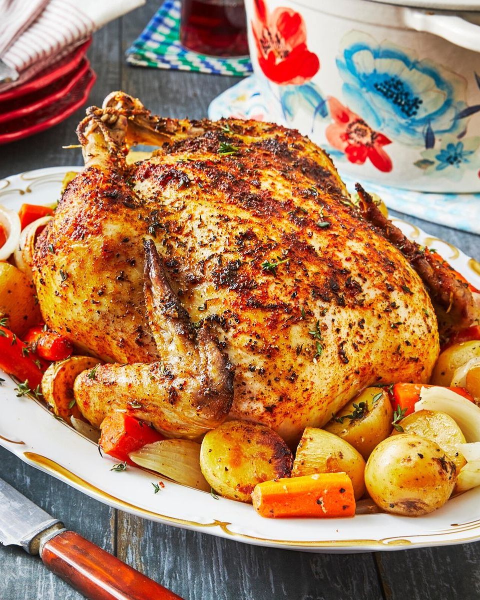 2. 2Toss together the potatoes, carrots, remaining onion wedges, 1 tablespoon of the olive oil, 1/2 teaspoon of the salt and ½ teaspoon of the pepper in a 6-quart round Dutch oven. Pour in the chicken stock. Place the chicken, breast-side up, on top of the vegetables and cover the Dutch oven with the lid.