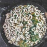 In a large cast iron skillet, heat 1/4 cup of olive oil and 1 tbsp of unsalted butter. Turn heat to medium-high and add the garlic, saute briefly, tossing regularly, until fragrant (this should take seconds, garlic should only gain a little color, do not burn it.)