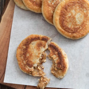 Flip to the other side and press down on the dough with a hotteok press until it becomes about 1/2-inch thick. Do not press it too thin; you don’t want to tear the dough and explode the filling inside.