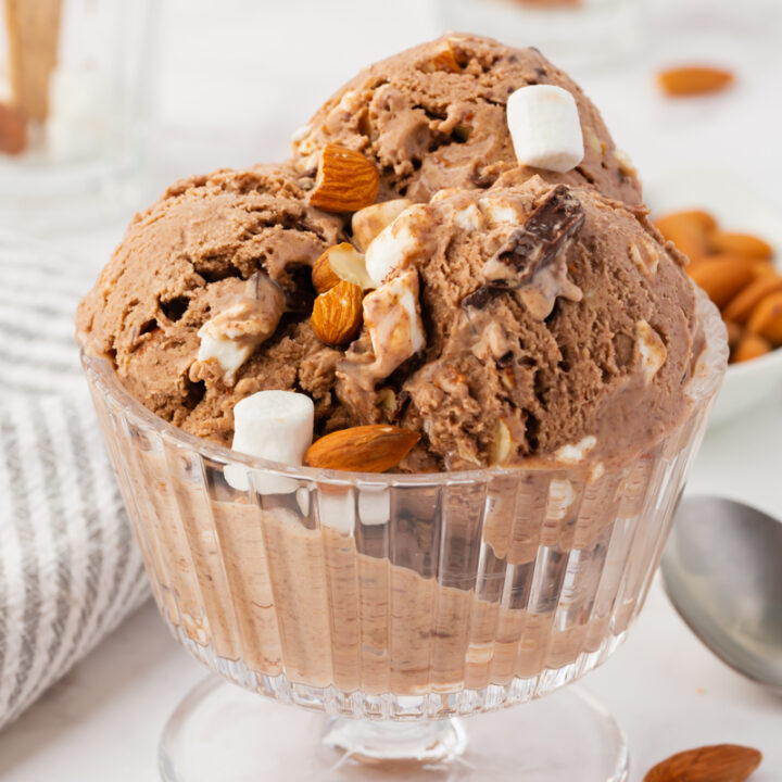 In the last two minutes, add the marshmallows, almonds, and remaining chopped chocolate and churn until evenly distributed.