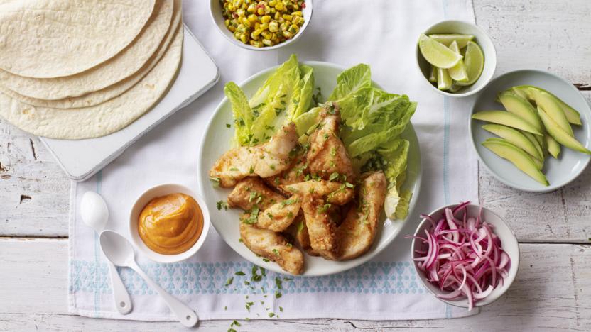6. Arrange the fish on a plate (lined with salad leaves, if so desired), sprinkle with some chopped fresh coriander, and take to the table along with the warmed tortillas. If you don’t want to add any salad to the fish directly, you may want to put a bowl of shredded iceberg or some other crisp leaves nearby.
