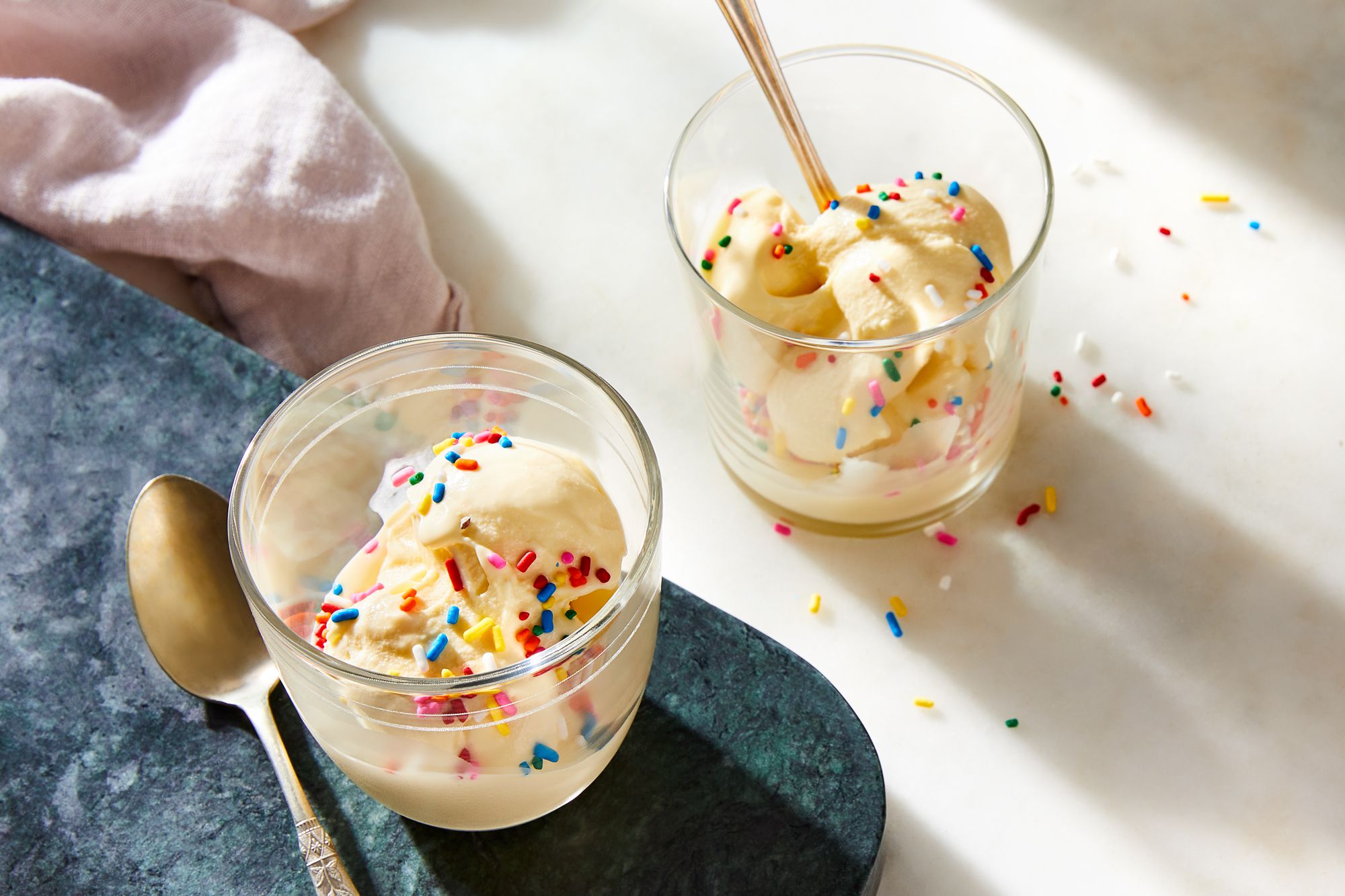 • Once cold, add the vanilla and churn in your ice cream machine, following the manufacturer’s instructions. Serve immediately—sprinkled with sparkling sugar or chocolate sprinkles, if you’d like—for an authentically soft frozen custard experience.