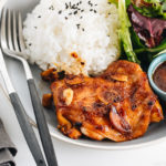 10. In a non-stick frying pan, heat 1 Tbsp neutral oil on medium heat. When the pan is hot, add the chicken, skin side down. Make sure to leave the marinade behind; the sauce will burn quickly, so do not add at this time.