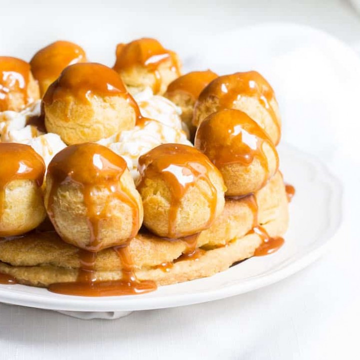 Stick one final pastry puff in the center of the dessert, then drizzle caramel all over. Refrigerate until ready to serve.