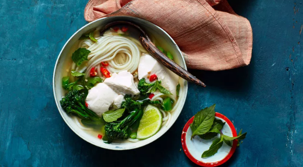Divide noodles among bowls. Add Broccolini to hot broth, then gently add tofu and heat through over medium. Spoon broth, Broccolini, and tofu over noodles. Garnish with herbs and sliced chile, and serve with lime wedges.