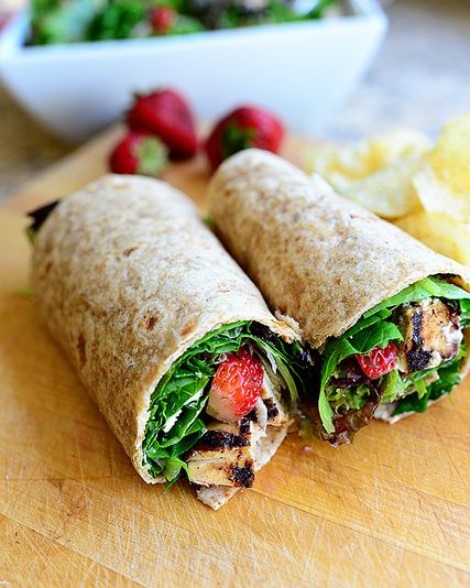 Place an equal amount of salad down the middle of each tortilla. Roll up, then slice in half.