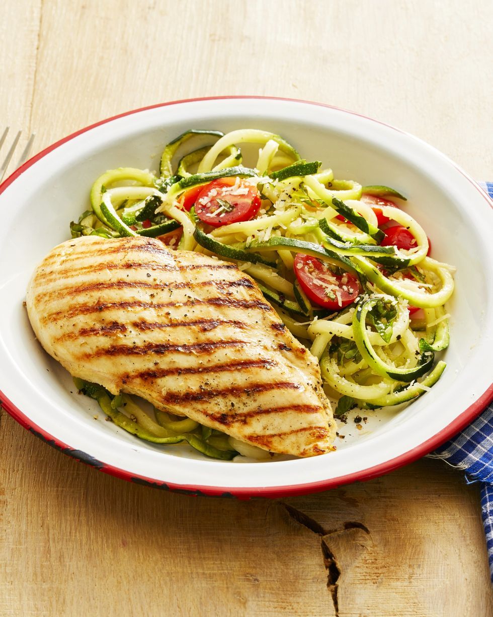 Add the tomatoes and parmesan and cook until warmed through, about 30 seconds. Remove from the heat, add the basil and toss. Serve the chicken with the zucchini noodles and sprinkle with more parmesan.