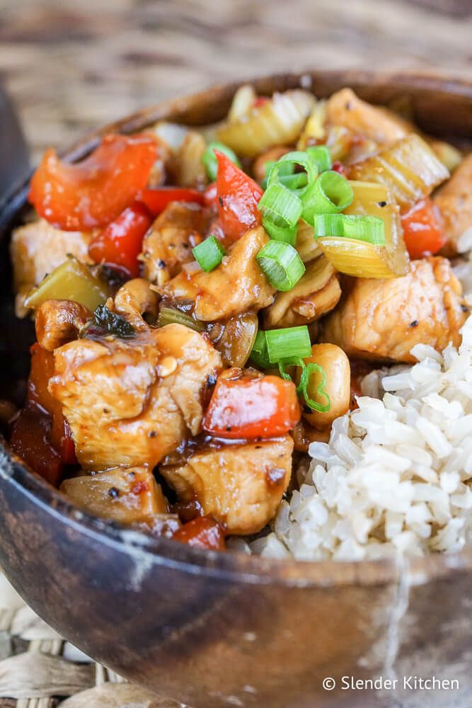 4. Add the chicken back to the pan and add the stir fry sauce and peanuts. Cook for 1-2 minutes so the sauce thickens. Remove from heat and let rest for 2-3 minutes so sauce can further thicken. Top with green onions.