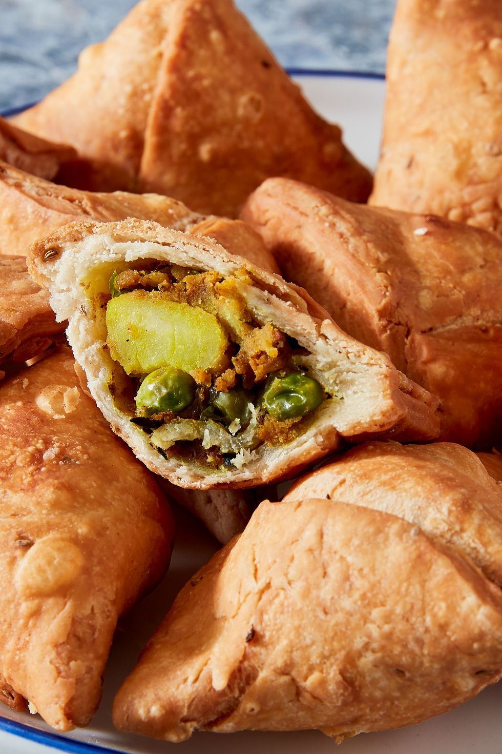 6. Fill a large, heavy- bottomed pot with about 2” of oil and fit with a deep fry thermometer. Place over medium heat until oil reaches 350°. A small piece of dough dropped into the oil should take a few seconds to start bubbling and rise to the surface. Without overcrowding the pot, working in batches if necessary, add samosas to oil and fry, turning occasionally, until deeply golden, about 10 to 12 minutes, adjusting heat as necessary to keep oil at 350°F. Using tongs or a slotted spoon, transfer samosas to a paper towel-lined plate as they are ready. Let cool slightly before serving.