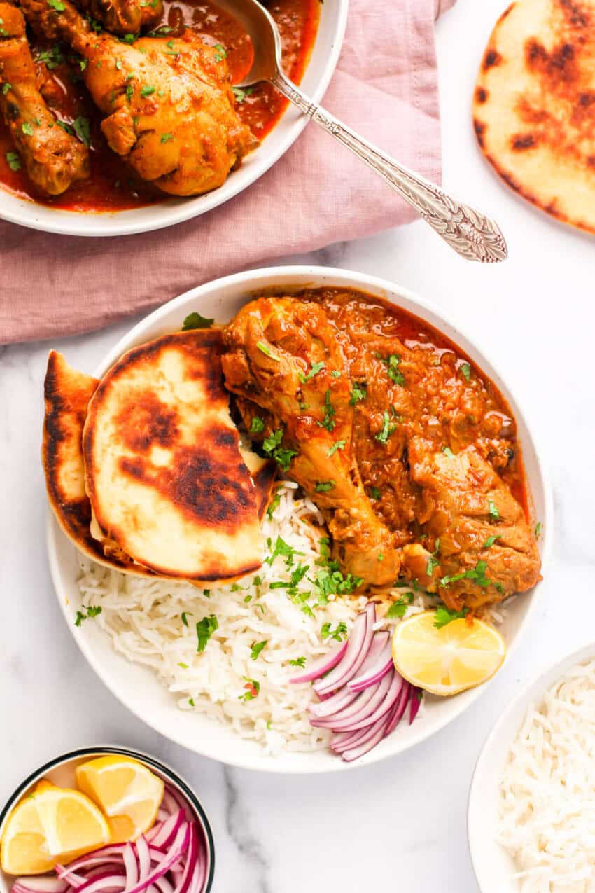 Add onions and salt and cook on medium heat for 8 to 10 minutes or until the onions turn light brown and translucent. Cover the pot with a lid to speed up the cooking of onions. Add ground spices, ginger, garlic, and chicken.