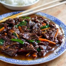 In the meantime, combine ¼ cup hot water with the tapioca or arrowroot starch in a small bowl. I used my fingers to dissolve the starch. Add the green onions to the beef and then add 4 tablespoons of the tapioca slurry liquid. Stir through and turn the pressure cooker off. The sauce will thicken as soon as you stir in the starch.