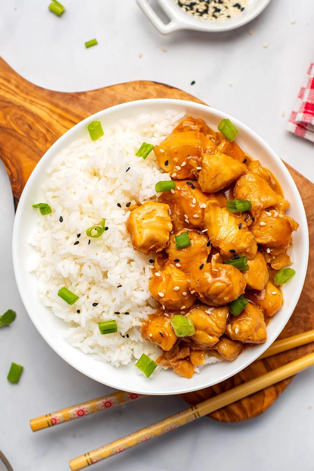 Slow cooker version: Make this easy orange chicken recipe in a crockpot. Combine everything in the crockpot, and cook on low for 5-6 hours or on high for 3-4 hours. To finish the dish, transfer most of the sauce into a pan and saute on the stove over medium-high heat to reduce slightly. Finish with the slurry as per the recipe.
