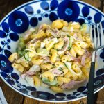 1. When the macaroni is cool, add the ham, cucumber, and onion.