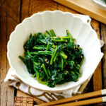 Then, push the leaves down to submerge them in water. Blanch until the stems are no longer rigid, about 30–45 seconds. Tip: American spinach is very soft and we can eat it raw, unlike Japanese spinach.