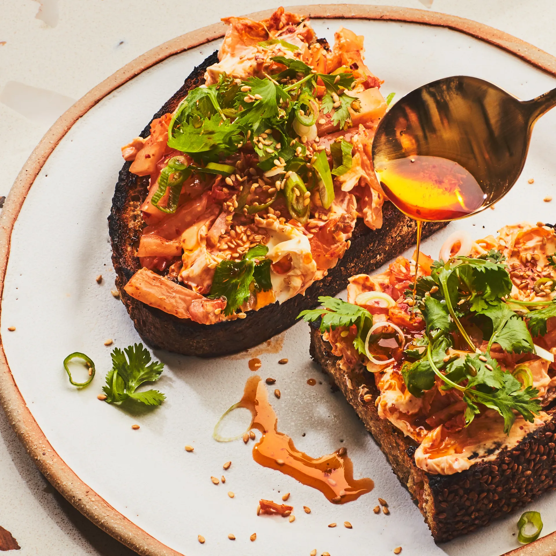 - Smear kimchi cream cheese over each slice of bread. Top with scallion salad and more kimchi (if using). Drizzle with chili oil; sprinkle with sesame seeds.