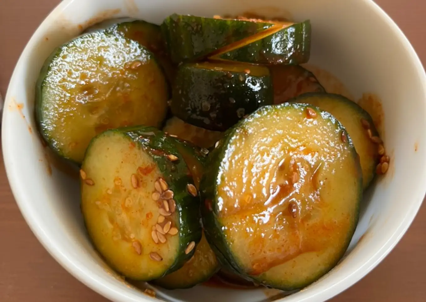 - Combine the dressing ingredients and mix with the cucumber. Add a sprinkle of sesame seeds and serve!