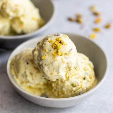 • Pour this mix into a parchment lined metal pan or a glass bowl. Seal it tightly using an airtight lid or a few layers of plastic wrap and stick it in the freezer. Chill for 6-8 hours for the ice cream to set properly. Enjoy!