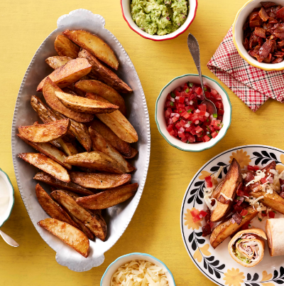 - For the fries: Preheat the oven to 450˚. Toss half of the potato wedges and 3 tablespoons olive oil on a rimmed baking sheet. Season with salt and pepper, then spread out evenly. Repeat with the remaining potatoes and olive oil on another baking sheet. Bake, rotating the pans halfway through, until the potatoes are tender and golden brown, 35 to 40 minutes. Season with salt.
