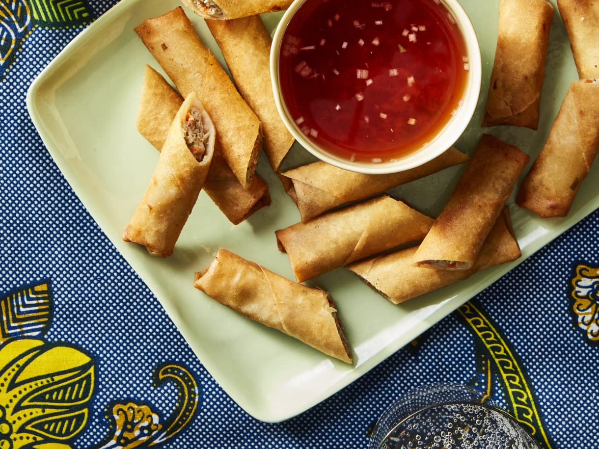 - Place one wrapper on the work surface in a diamond shape (keep the remaining wrappers covered with the towel). Place 1 1/2 tablespoons of the filling 3 inches from the bottom corner and form into a 5-inch long log. Fold the bottom corner up and over the filling, pulling the wrapper taut over the filling. Fold the left and right sides over the filling so the points meet at the center and crease the sides so it now looks like an envelope. Roll from the bottom up into a tight log, stopping when you get close to the top and you have a small triangle left. Dip a finger into the egg white and use it to dampen the triangle, then finish rolling all the way up (the egg white will help “glue” the wrapper together).