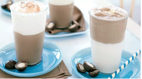 - Place remaining 1/2 cup milk and remaining 3 tablespoons malt powder in clean jar of blender, and process until malt is dissolved. Add half the chocolate, or strawberry, ice cream, and blend until smooth. With motor running, add remaining ice cream, one scoop at a time, until fully incorporated. Divide half the shake between two empty glasses, and top off the two partially filled glasses from freezer with the remainder. Allow the half-filled glasses to freeze for 10 minutes. Stir reserved vanilla shake before topping off remaining glasses. Garnish with malted-milk powder and malted-milk balls if desired, and serve immediately.