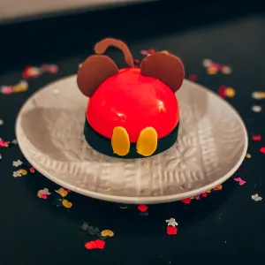 - Carefully unmold the mousse domes and place one dome on top of each cake round.