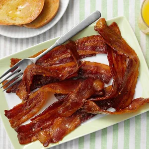 - Preheat oven to 350°. Line a 15x10x1-in. pan with foil. Combine brown sugar, pepper flakes, cayenne and ground pepper. Dip bacon slices in sugar mixture; place in prepared pan.