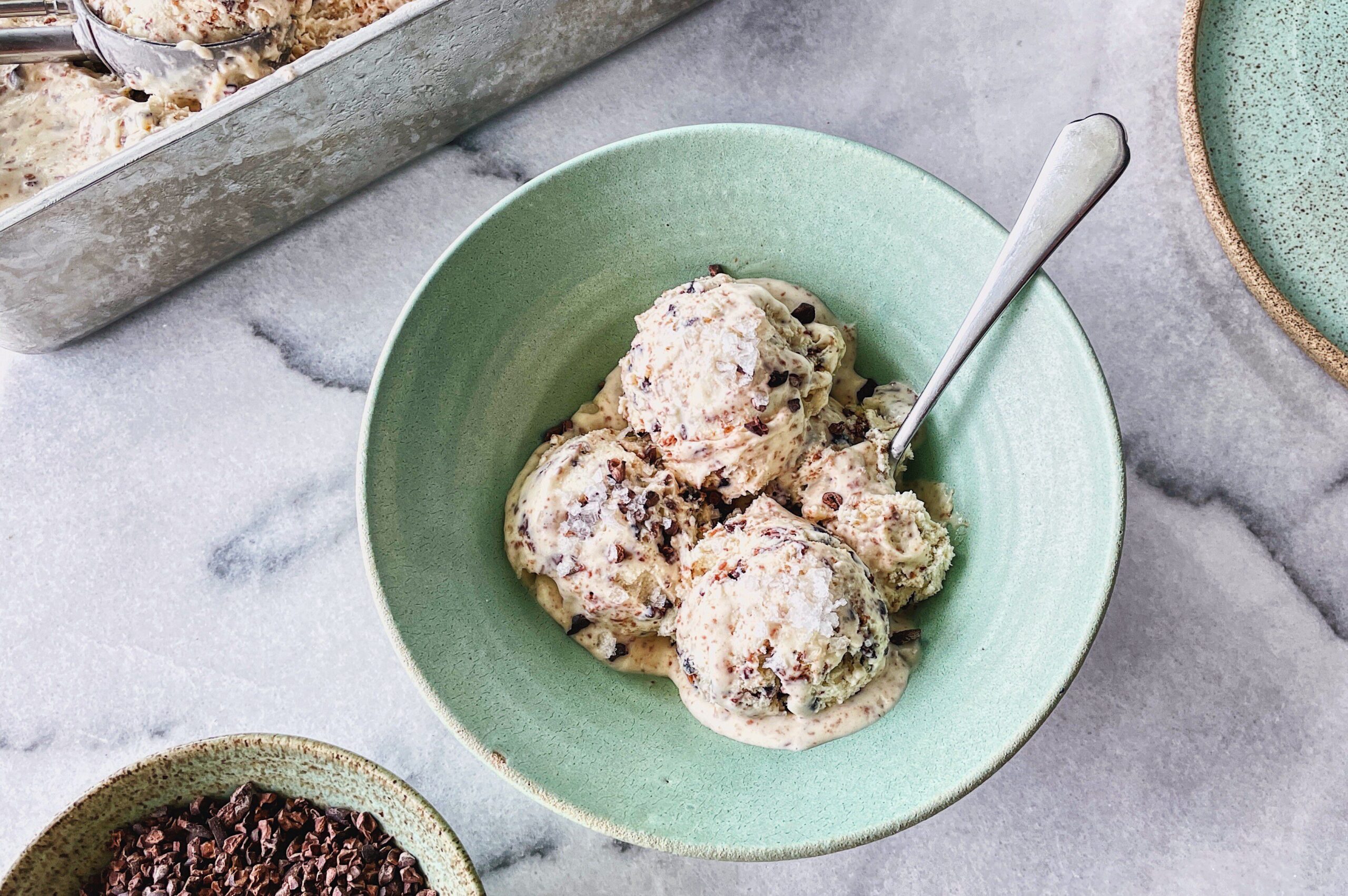 • Gently fold the chocolate and cocoa nibs in the whipped cream mixture, pour the mixture in a loaf tin or a couple of quart containers. Cover the ice cream with parchment paper (touching the ice cream) to prevent freezer burn.