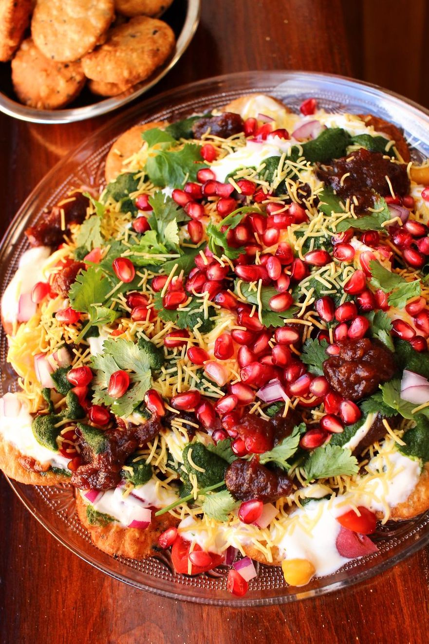 - On a large plate, place 9 to 12 papdis in a single layer. Top with cooked potatoes, chickpeas, yogurt, tamarind-date chutney, green chutney, red onion, red chilis (if using), tomatoes, sev, cilatro, and pomegranate as desired. Sprinkle over chaat masala to taste before serving.