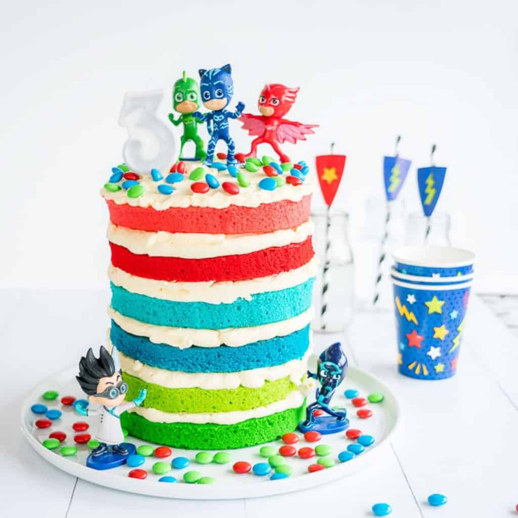 In addition to the edible ingredients, you will also need: 20 cm round cake tin (2 cake tins are even better) Cake mixer or Electric beater, Baking paper, 3 x bamboo skewers, piping bag with large nozzel, PJ masks figurines