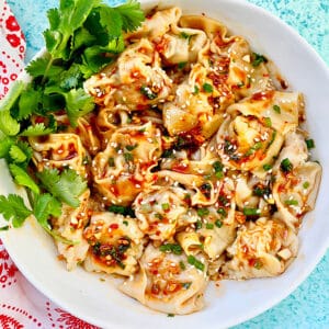 In a large bowl, mix together all filling ingredients. Have a small bowl of water and wonton wrappers ready.