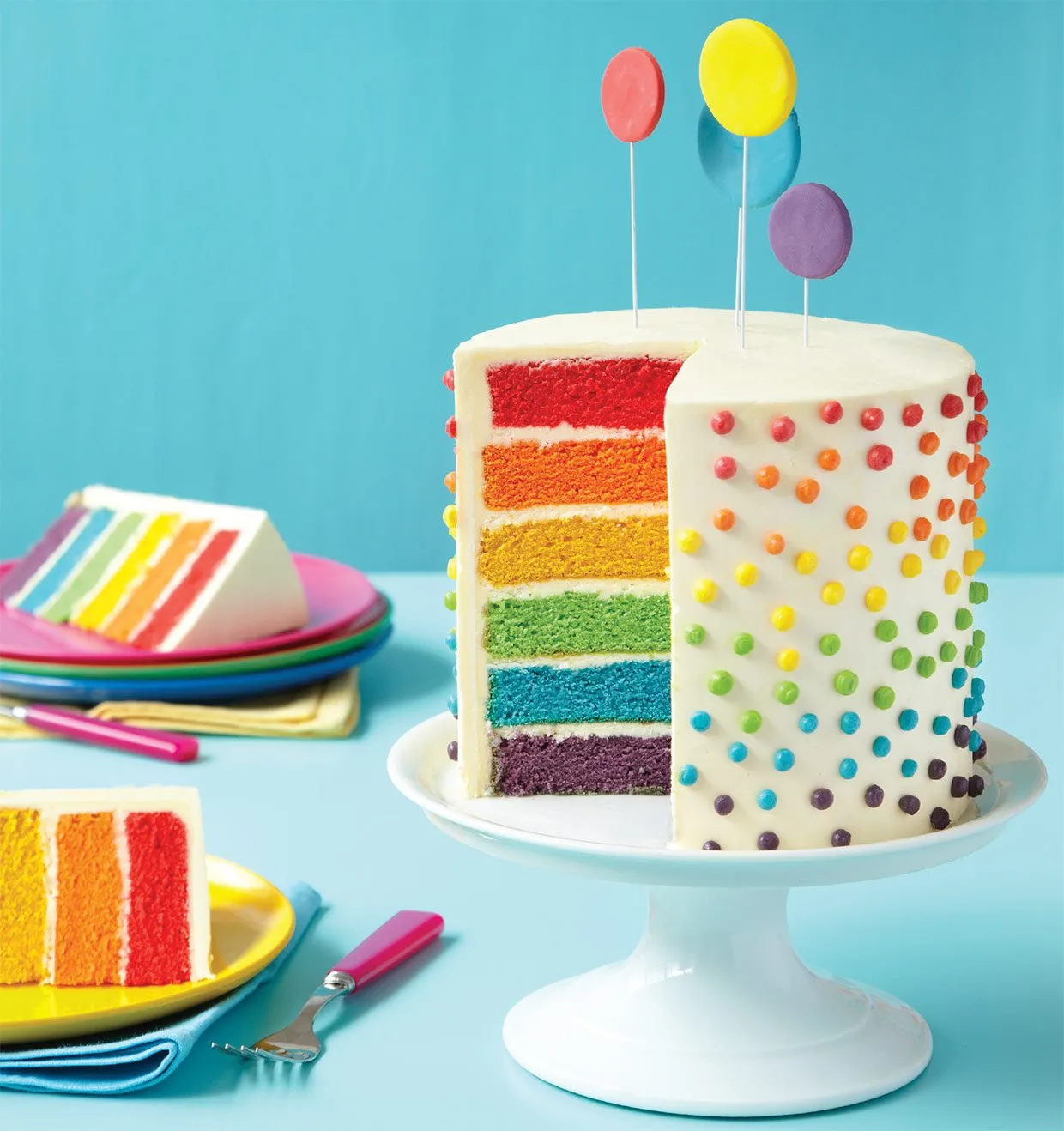 - Starting with a little paste, gently but thoroughly mix one color into each portion of batter until you have a rainbow of six vibrant colors. Pour one portion of batter into each of the three prepared pans and bake for 25–30 minutes until the sponge is springy and a toothpick inserted into the center comes out clean. Allow the cakes to cool in the pans for 5 minutes, then turn out onto a wire rack. Reline and grease the pans and bake the final three layers. Allow the cake layers to cool completely.