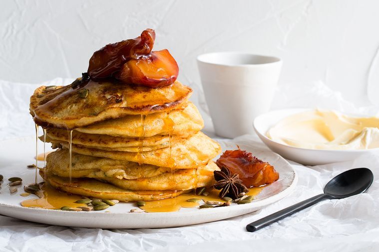 Serve the hotcakes stacked with peaches, seeds, extra maple syrup and creme fraiche on the side.