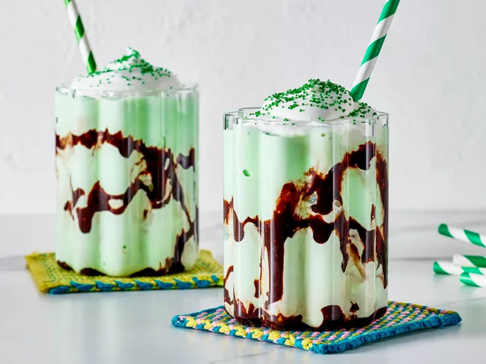 - Drizzle chocolate syrup around the inside of 2 tall glasses; pour shake into the glasses. Top with whipped cream and green sugar.