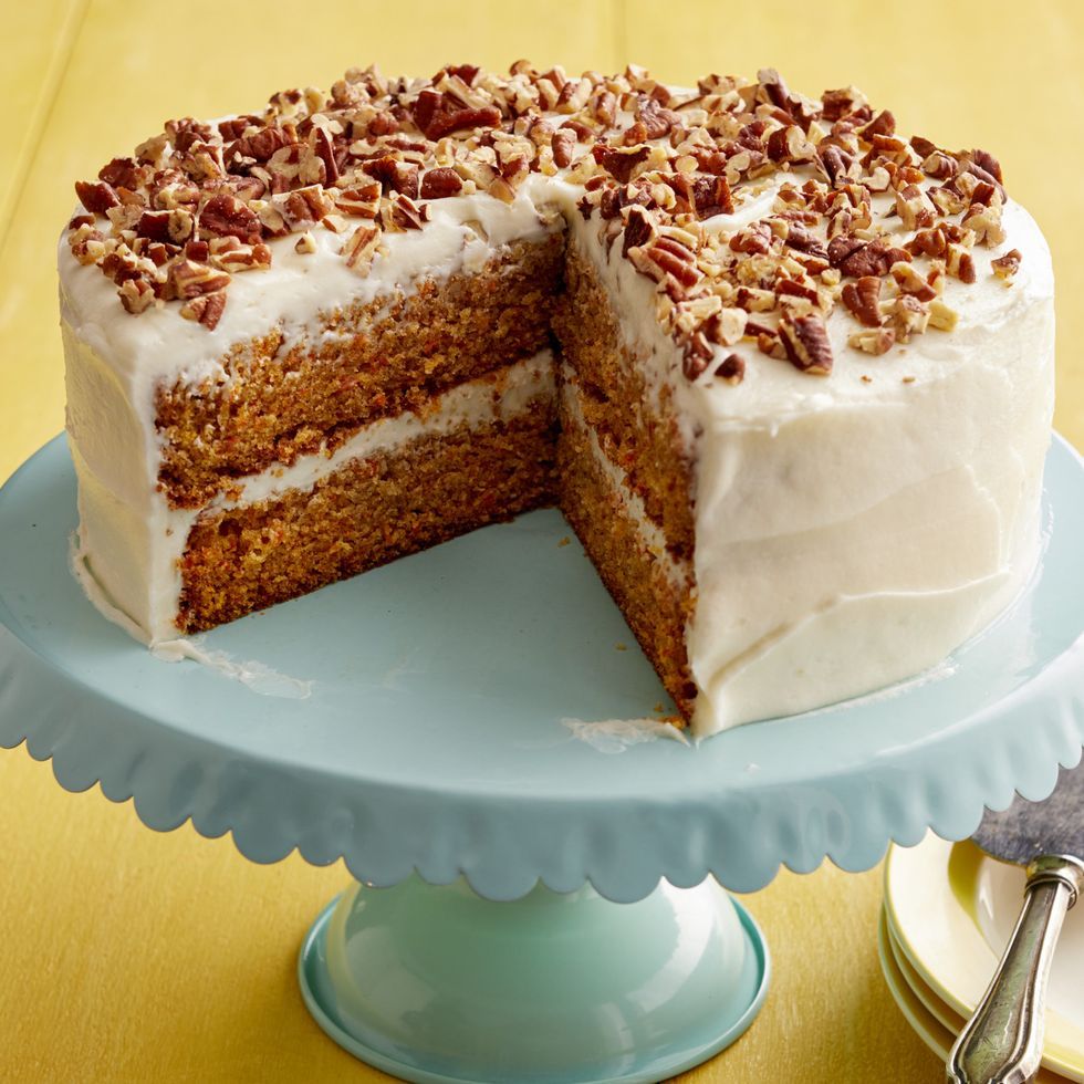 - For the frosting: In large bowl, beat the butter and cream cheese with a mixer on medium speed until smooth. Add the powdered sugar and vanilla, and beat until fluffy. Place 1 cake layer on a platter and spread with frosting, then top with the second layer. Frost the top and sides of the cake with the remaining frosting. Top the cake with the pecans.