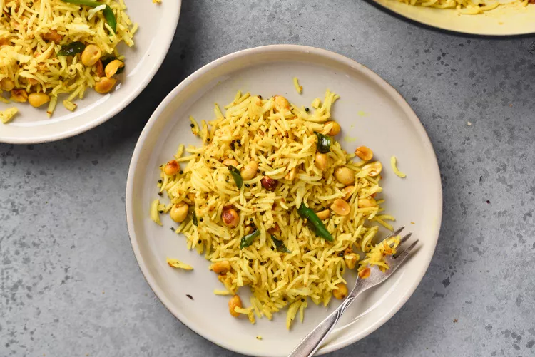 - Heat the oil in the same pan on medium heat until it shimmers. Add the mustard seeds, curry leaves, and green chiles. Fry the mixture until the splattering stops.